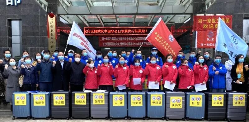 出征仪式上,湘雅医院刘伏友教授为出征的医护人员壮行:“在这个时期进入武汉前线,责任重大,使命光荣,相信大家的努力会留在2020抗击新冠的历史上,希望大家做好个人防护,积极救治尿毒症新冠肺炎患者,期待大家胜利归来!” 医疗队长程卫兵、副队长俞翔郑重地接过旗帜,并由俞翔带领全体医疗队员宣誓。 抗击疫情,誓师出征 在此危难的时刻,我庄严宣誓: 我自愿加入抗击新冠肺炎的诊治工作! 不负重托,不畏艰难; 不计报酬,不论生死; 不辱使命,救死扶伤; 秉承中国警示,牢记医者初心! 弘扬白求恩精神,逆行负重拼搏! 听从党的号召召之即来, 来之能战,战之必胜! 武汉加油!中国加油! 医疗队踏上武汉的土地,白求恩公益基金会名誉副理事长陈少波领队,武汉市第四医院袁英红书记、赵志刚主任、董骏武主任、进贤白求恩血液净化中心郭敬霞老师,新华医疗健康产业(湖北)有限公司总经理陈翔先生等到武汉高铁站迎接医疗队的到来。武汉市第四医院袁英红书记代表医院全体领导班子,对白求恩血液透析医疗队的到来表示热烈欢迎,她指出,武汉市第四医院是目前武汉最大的定点救治感染新冠肺炎的血液透析患者的医院,任务繁重,感谢大家在这艰难的时刻,选择了逆行武汉,坚定地和四院2000多名员工一起并肩战斗。相信白求恩血液透析医疗队的到来,将对目前武汉血液透析新冠肺炎的患者救治工作提供极大的帮助,我们一起努力,共度时艰,共赢胜利!